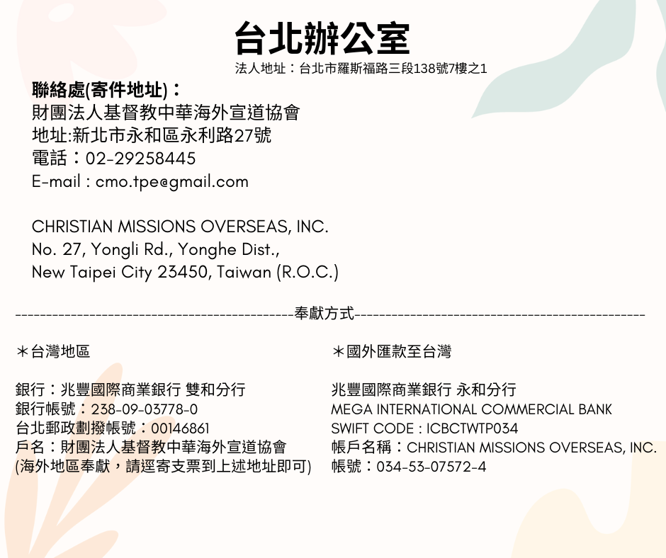 泰國清邁宣道中心:207 Ko Klang Road, Soi2, Moo3 Email: cmoth@loxinfo.co.th |